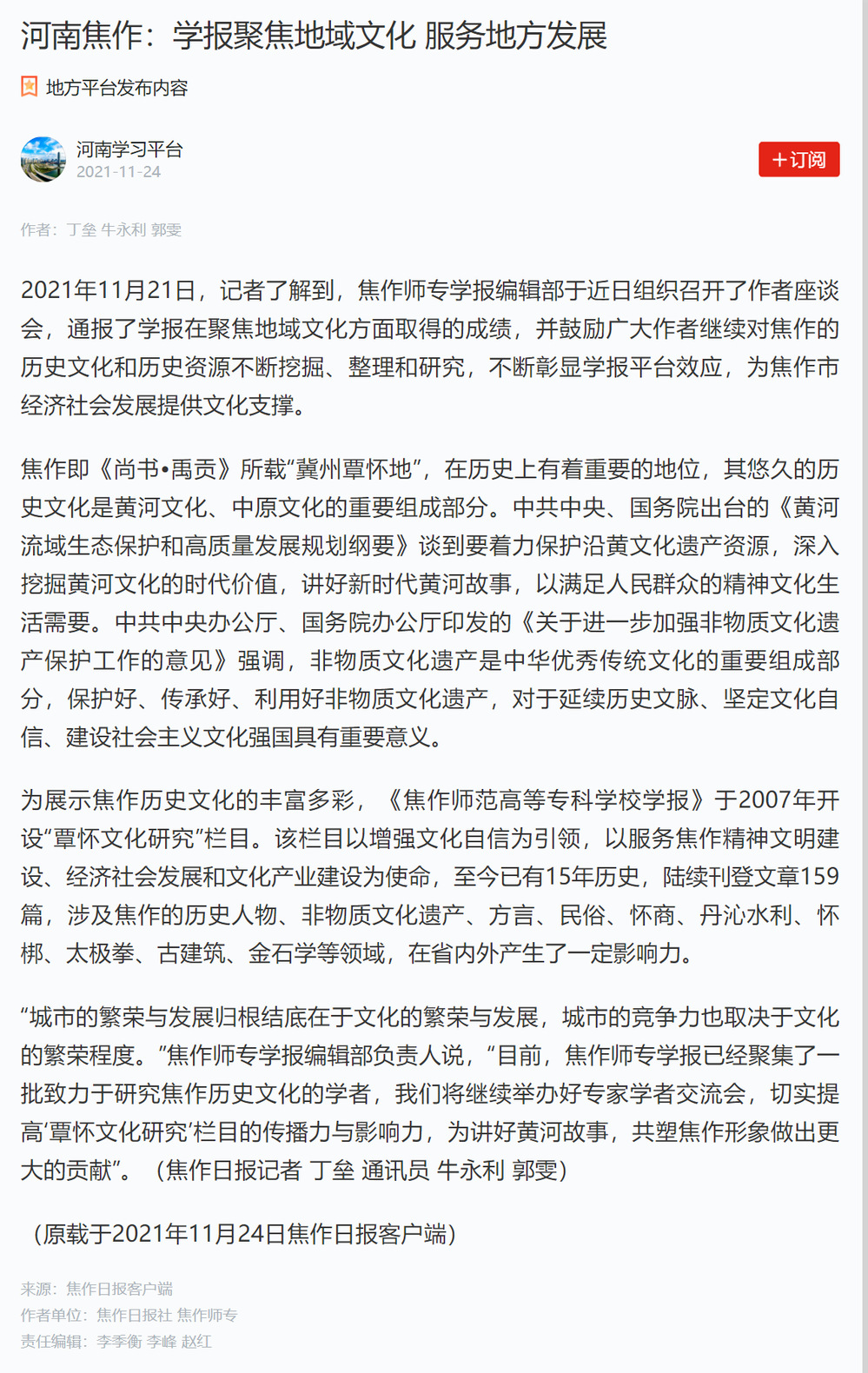 11月24日 www.91视频.com,学习强国河南学习平台以《河南焦作:学报聚焦地域文化 服务地方发展》为题,报道了焦作师专学报编辑部组织召开的作者座谈会。