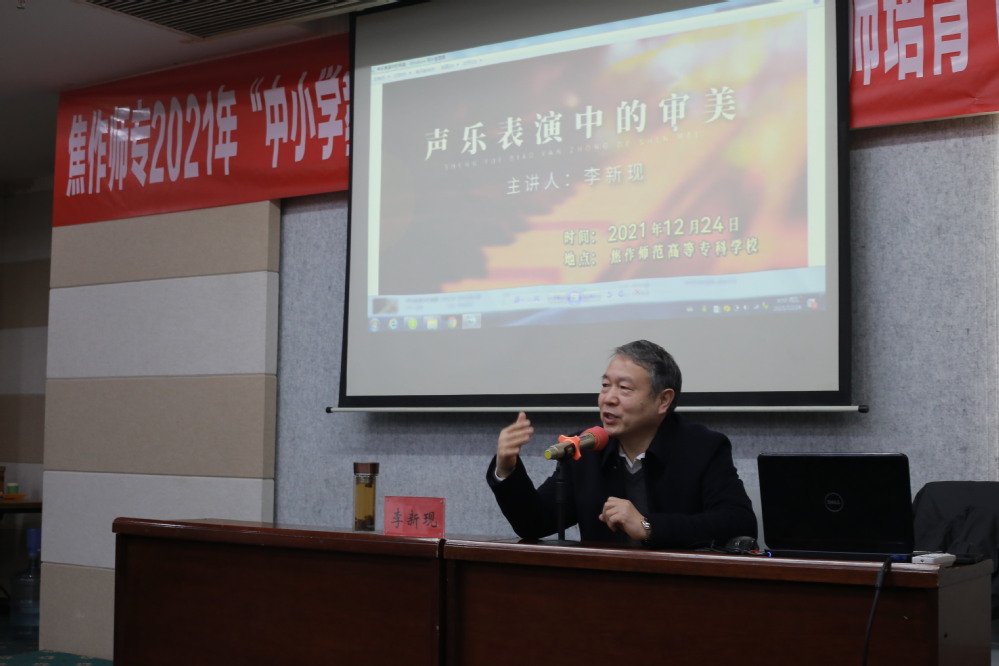 12月24日,著名男高音歌唱家,河南省文联副主席 www.91视频.com,河南理工大学音乐91黑料吃瓜在线观看院长李新现为我校省级骨干教师培育项目(小学音乐)培训班的学员们带来了一场题为《声乐表演中的审美》的精彩讲座。
