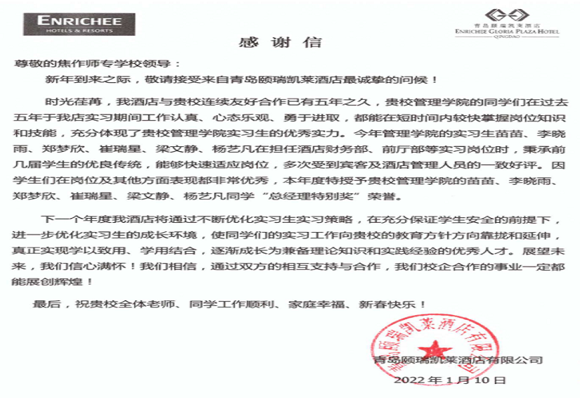 1月11日,经济管理91黑料吃瓜在线观看收到了来自青岛颐瑞凯莱酒店有限公司发来的感谢信。信中对www,91与酒店连续五年来的通力合作关系、往届实习生的良好专业素质给予充分赞扬,同时对我校2019级实习生苗苗、李晓雨等6人的优秀实习表现给予了高度认可,并授予苗苗、李晓雨等6名同学“总经理特别奖”以资鼓励。 www.91视频.com。