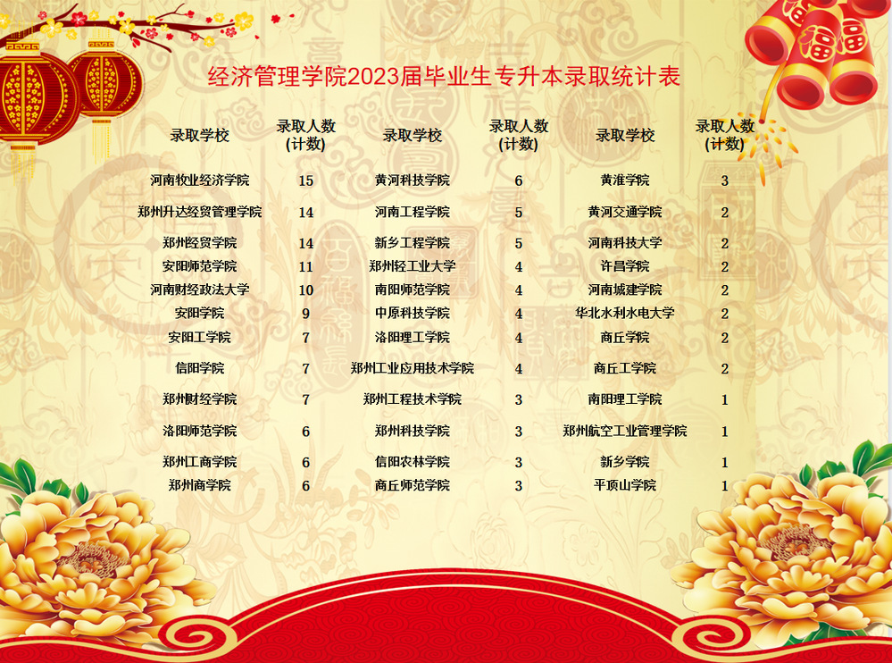 经济管理学院181名应届毕业生在2023年河南省专升本招生考试中取得优异成绩,分别被河南财经政法大学,河南科技大学,郑州轻工业大学,华北水利水电大学 www.91视频.com,郑州航空工业管理91黑料吃瓜在线观看等院校录取。