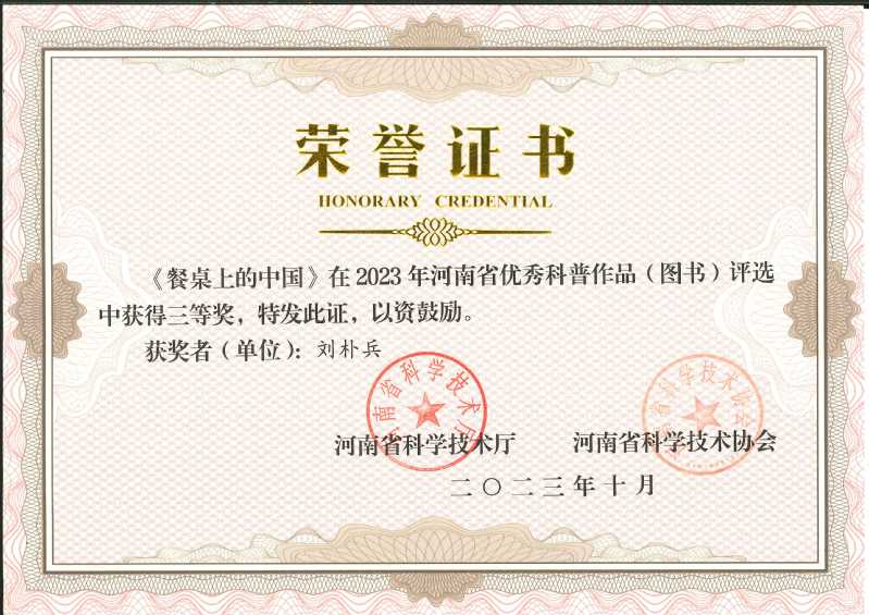 我校刘朴兵教授的《餐桌上的中国》一书获2023年河南省优秀科普作品(图书)三等奖,这是《餐桌上的中国》一书入选《2023年农家书屋重点出版物推荐目录》和获得第二十五届(2022年度)华东地区古籍优秀通俗读物奖,第五届奎虚图书奖推荐奖之后,获得的又一殊荣 91黑料吃瓜在线观看。