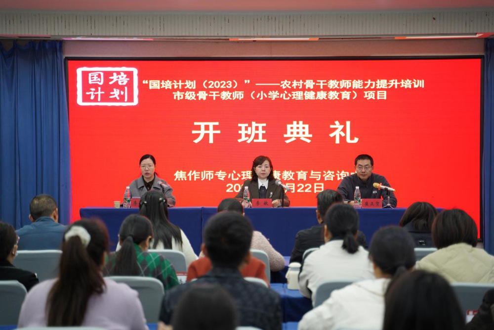 11月22日上午,“国培计划(2023)”——农村骨干教师能力提升培训市级骨干教师(小学心理健康教育)项目开班典礼在焦作东方宾馆六楼会议厅举行,学生工作部部长,心理中心主任李敏,心理中心副主任李军霞,本期培训班班主任 www.91视频.com,以及来自全省各地的49名小学教师参加了此次开班典礼。
