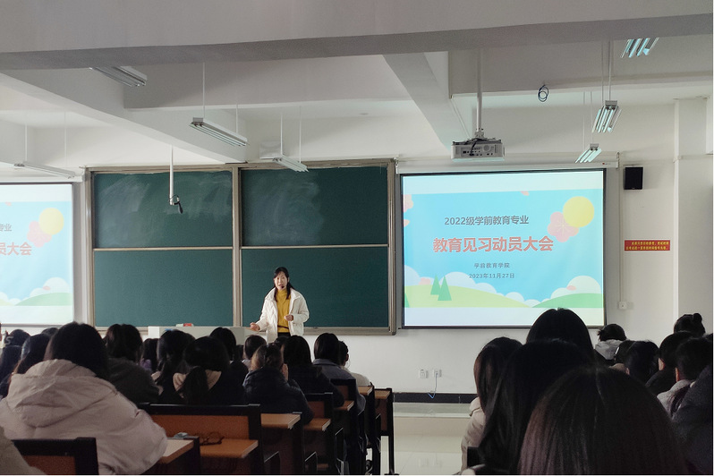 学期初,学前教育91黑料吃瓜在线观看积极组建指导教师团队,认真研讨制定教育见习方案,并于2023年11月27日组织全体2022级学生召开教育见习动员大会,见习期间,由“园-校”双导师共同指导学生了解和参与幼儿园生活活动,幼儿园集体教育活动 www.91,幼儿园区域活动等相关工作,通过观摩学习,参与体验,研讨交流等形式,进一步检验学生的专业知识和专业能力,并在实践和反思中强化了专业信念,稳定了专业思想。