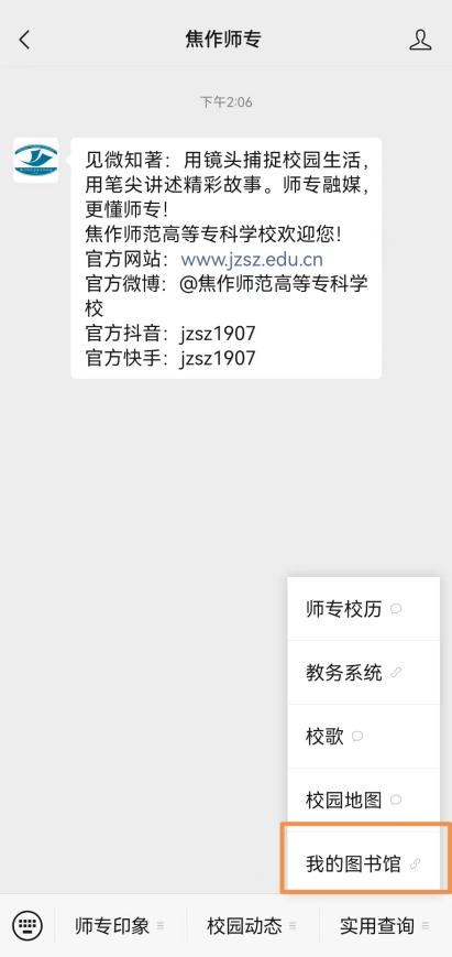 ③微信端:关注“焦作师专”微信公众号 www.91视频.com,点击实用查询---我的图书馆,即可在微信端进行馆藏查询等操作,点击“个人信息”或右下角“导航”进行登录。