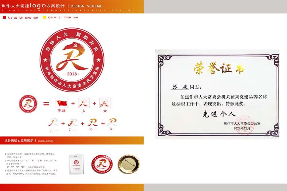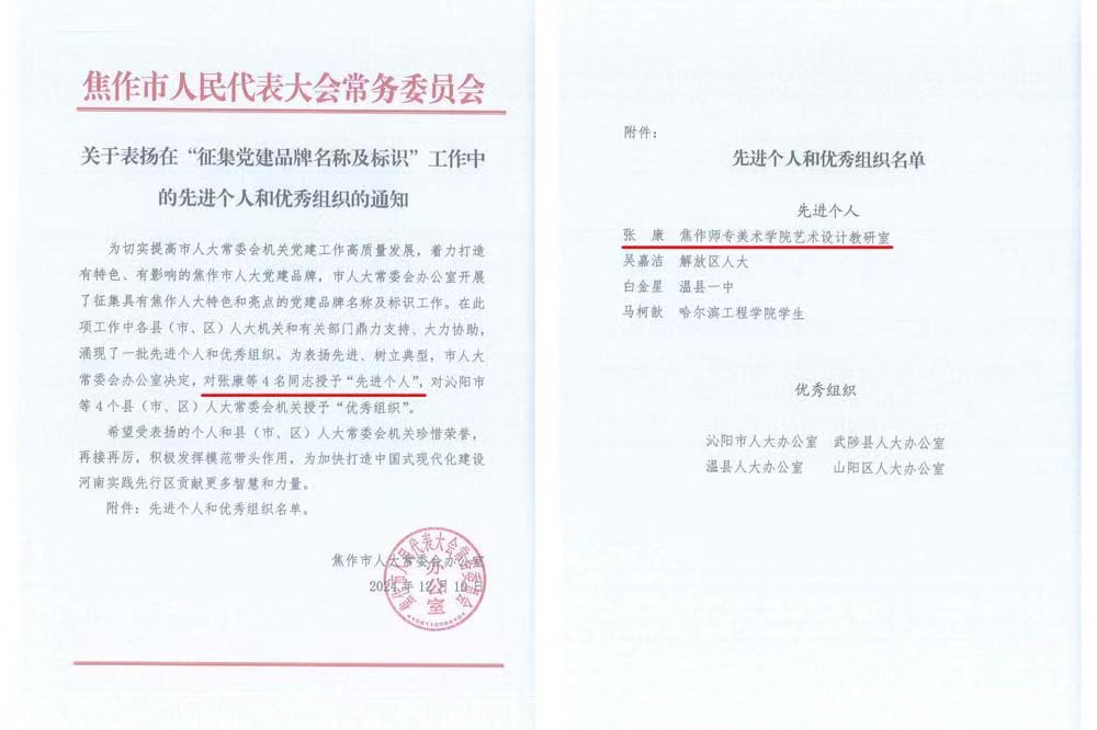 近日,焦作市人大常委会举行了机关党建品牌名称和标识征集活动,美术91黑料吃瓜在线观看教师张康的设计方案被正式采纳,同时 www.91视频.com,该教师也被评为此次征集活动先进个人。
