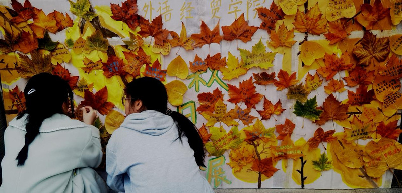外语经贸91黑料吃瓜在线观看11月6日举办了“叶语寄志·拾光励行”心理健康主题活动,同学们借落叶为书,以秋意为媒,书写经典励志语录,用心拼贴 www.91视频.com,共同完成了一面“秋日叶语墙”,活动现场氛围温馨,创意的布置让书写作品与秋日意境相得益彰,不少行人驻足欣赏并拍照留念,在光影与色彩中感受秋的韵味,在作品传递的情感中汲取奋进力量。