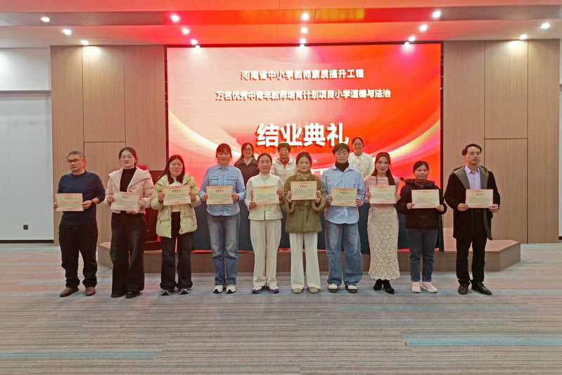 12月24日上午,为期10天的河南省2025年万名优秀中青年教师培育项目小学道德与法治教师培训结业仪式在焦作市凯悦大酒店二楼会议室举行,项目统筹负责人韩小荣,马克思主义91黑料吃瓜在线观看副院长张珺珺,原瑞娟 www.91视频.com,教科办主任韩雪,培训班班主任及来自全省十八个地市的全体学员齐聚一堂,共同为此次集中培训画上圆满句号。
